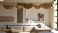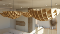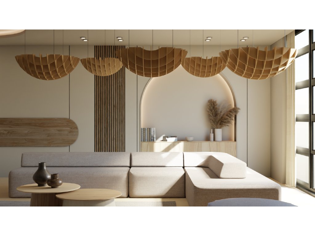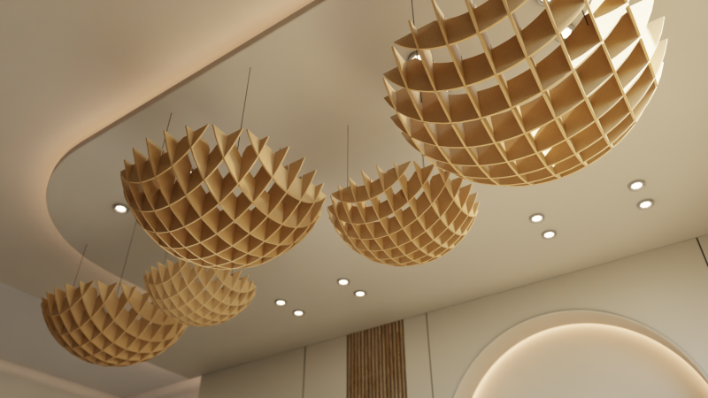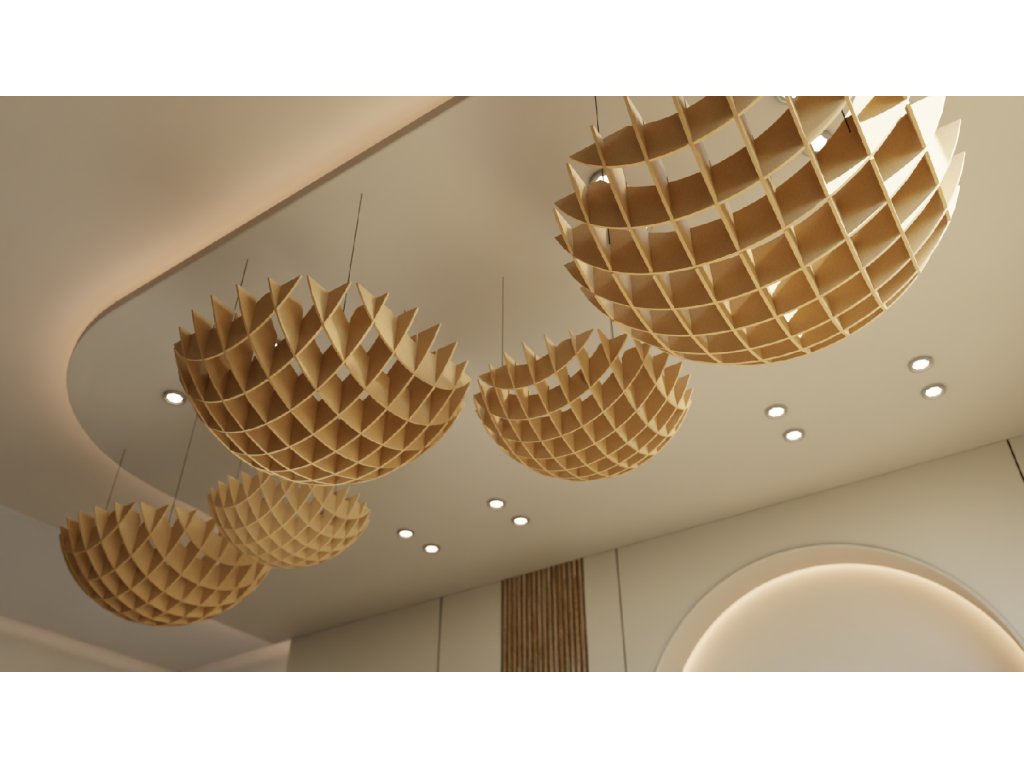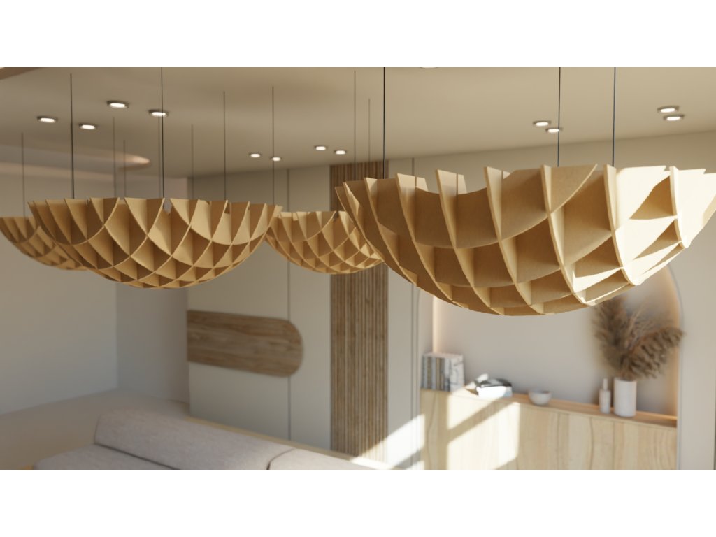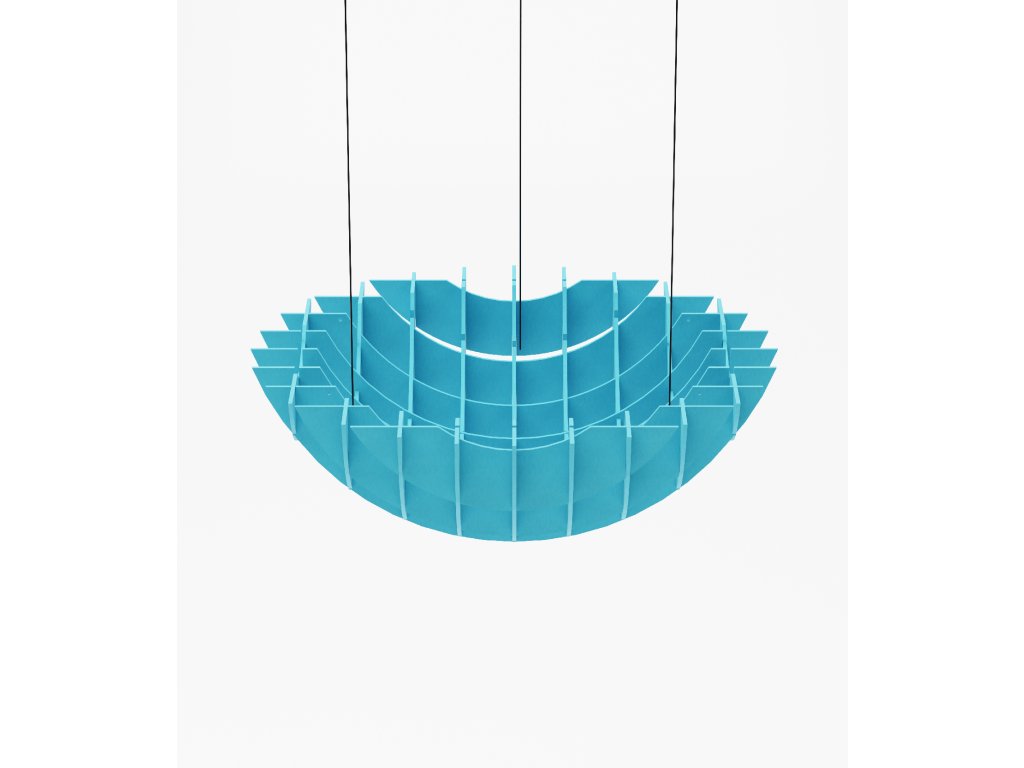 Designové závěsné AcouBaffle Hemisphery z PET plstě pro funkční stropy a esteticky přitažlivé prostředí. Jedná se o moderní řešení pro zlepšení akustického komfortu a jedinečného vzhledu v jakémkoliv prostoru – od kanceláří a konferenčních místností až po domácí pracovny a obytné prostory.