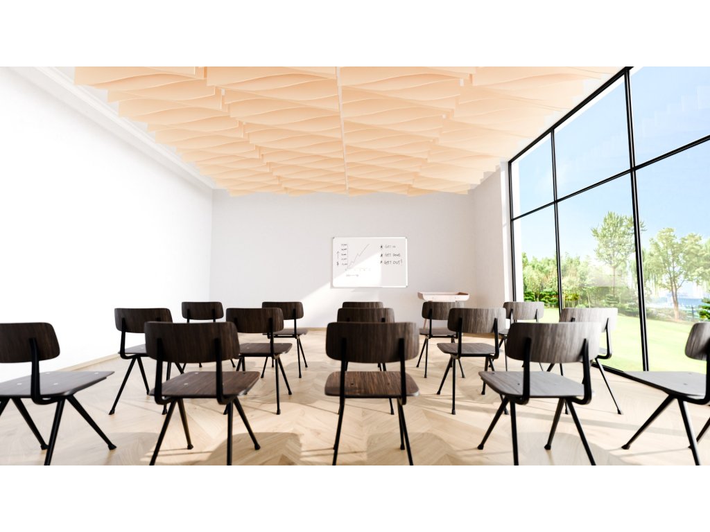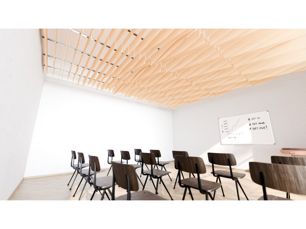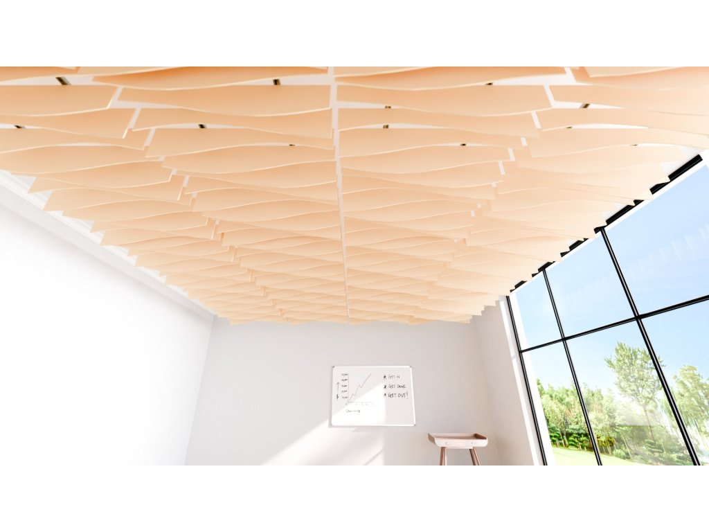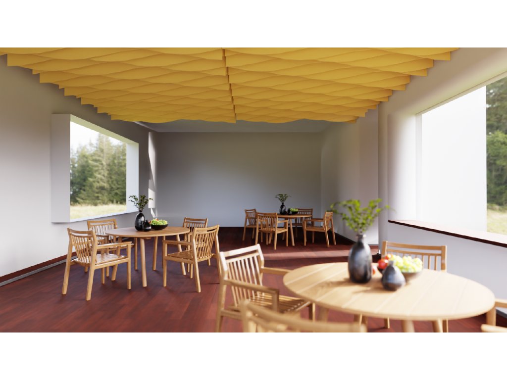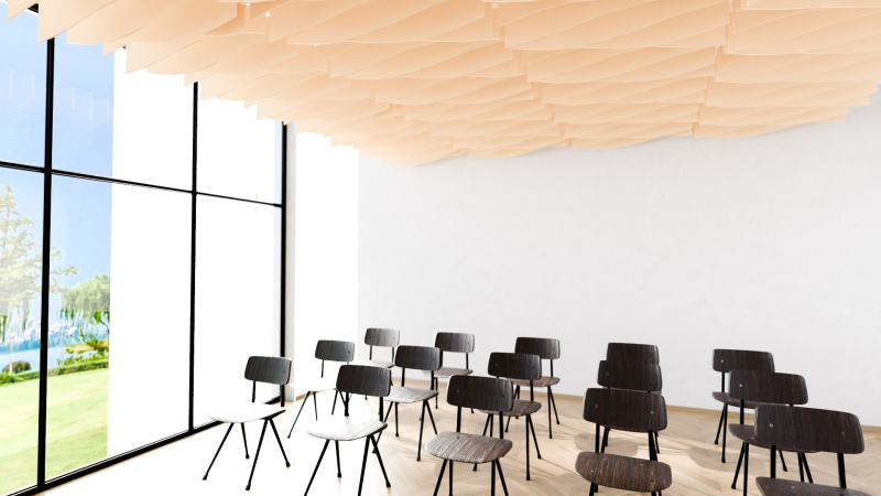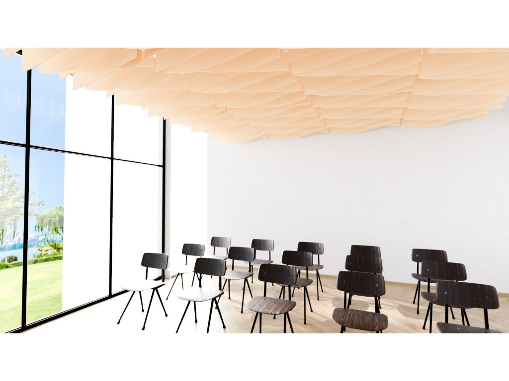Akustické stropní Baffle panely z PET plsti pro akustické i pohledové úpravy stropního prostoru.
