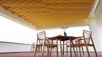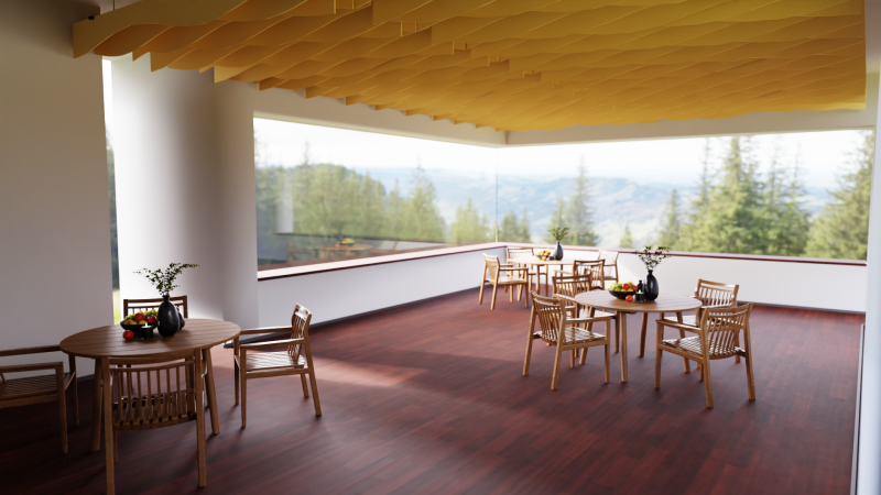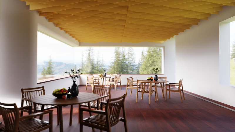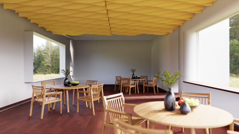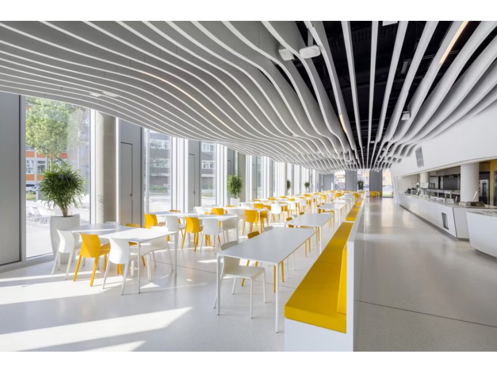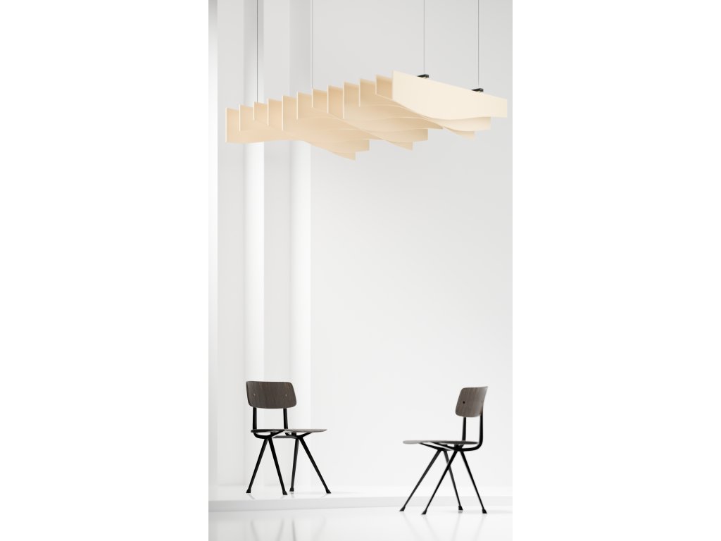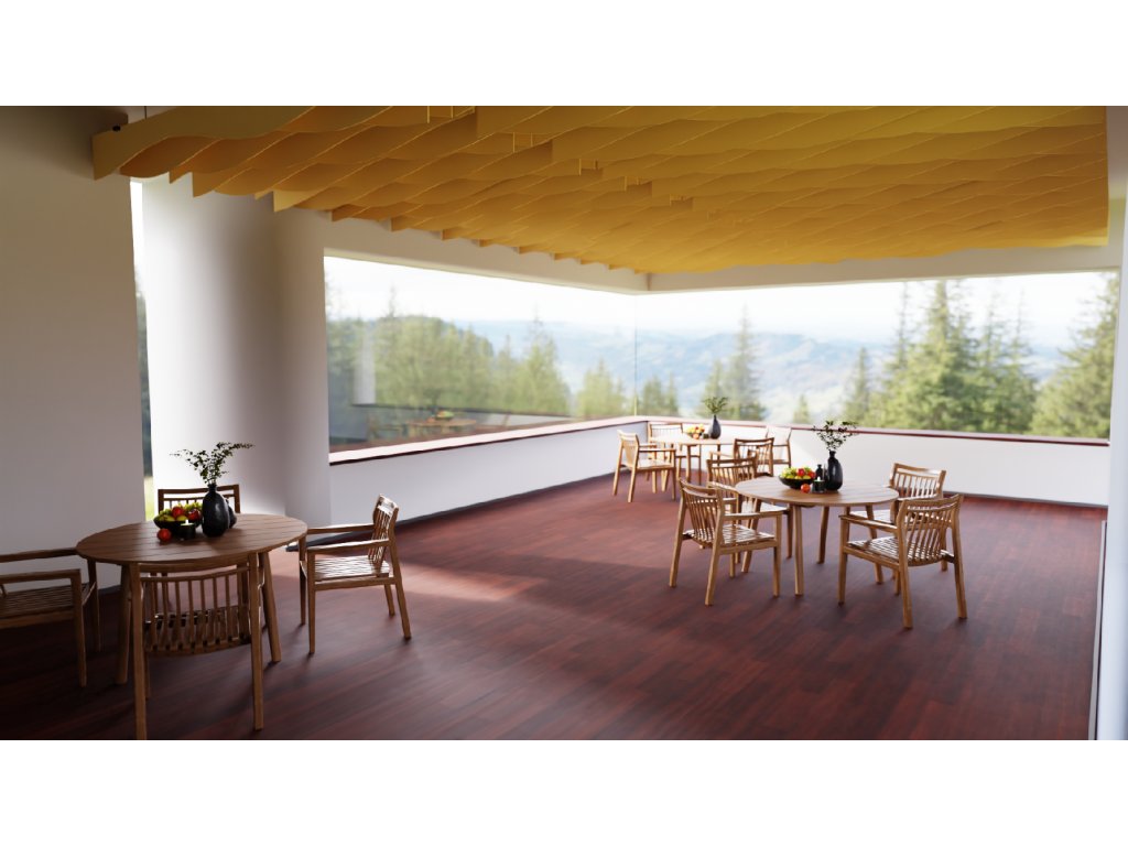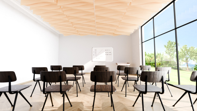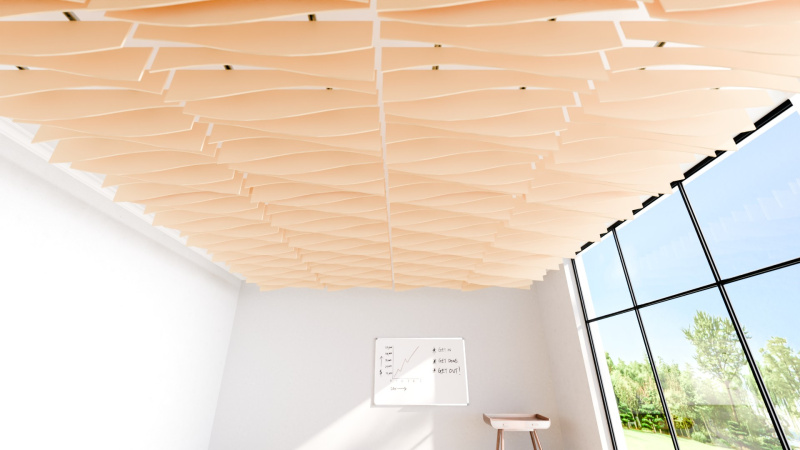 Akustické stropní Baffle panely z PET plsti pro akustické i pohledové úpravy stropního prostoru.