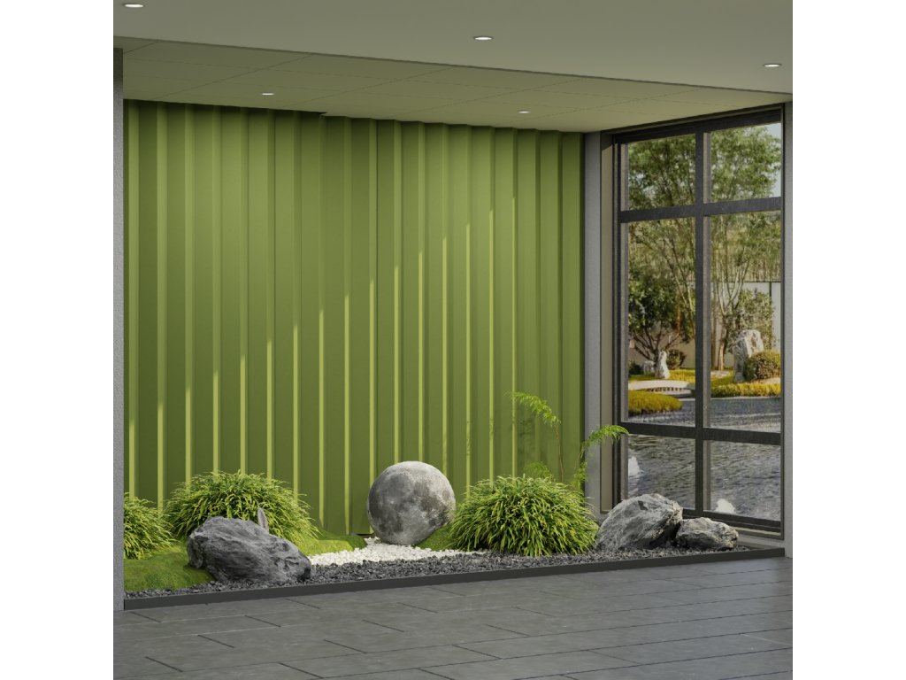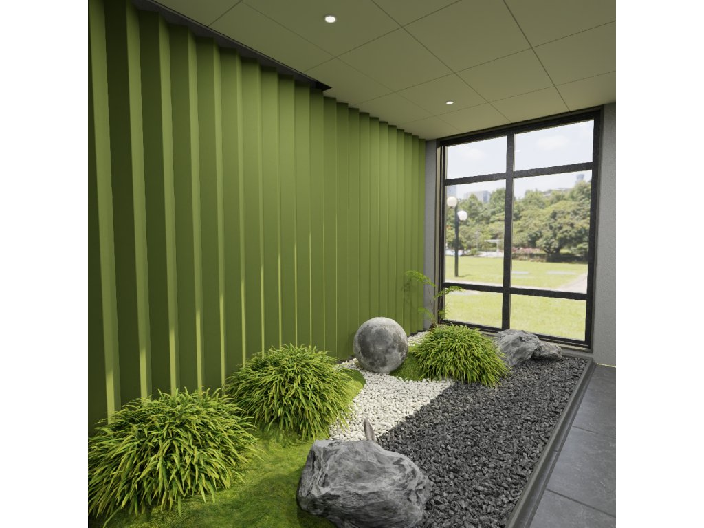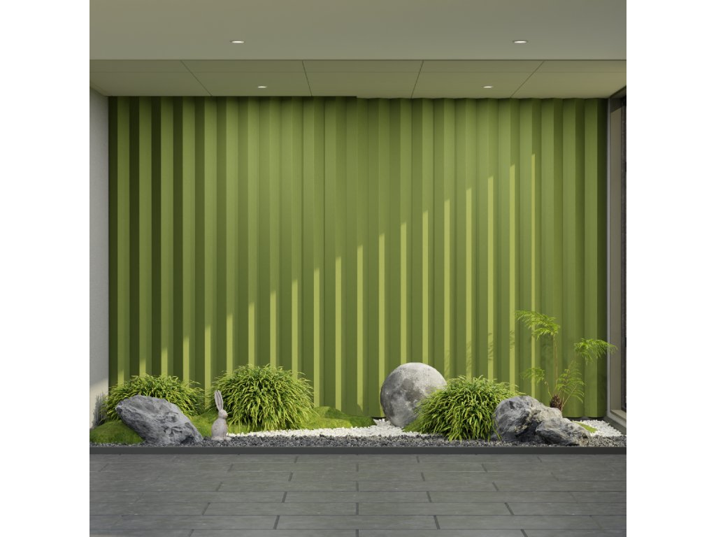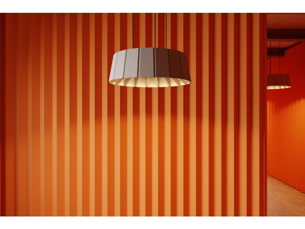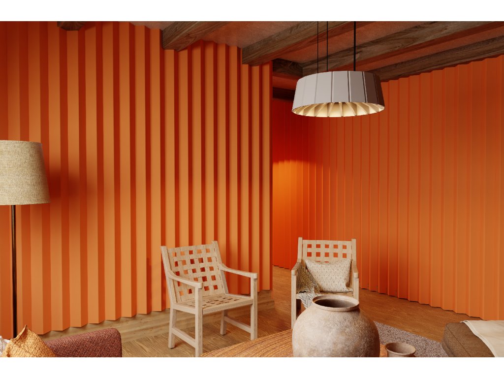 Díky laťové konstrukci a trojúhelníkovému profilu vytváří AcouSlat Delta rytmickou strukturu, která pracuje se světlem a stínem a dodává interiéru hloubku. Při instalaci více panelů vedle sebe vznikají elegantní akustické obklady s jednotným vizuálním stylem.