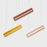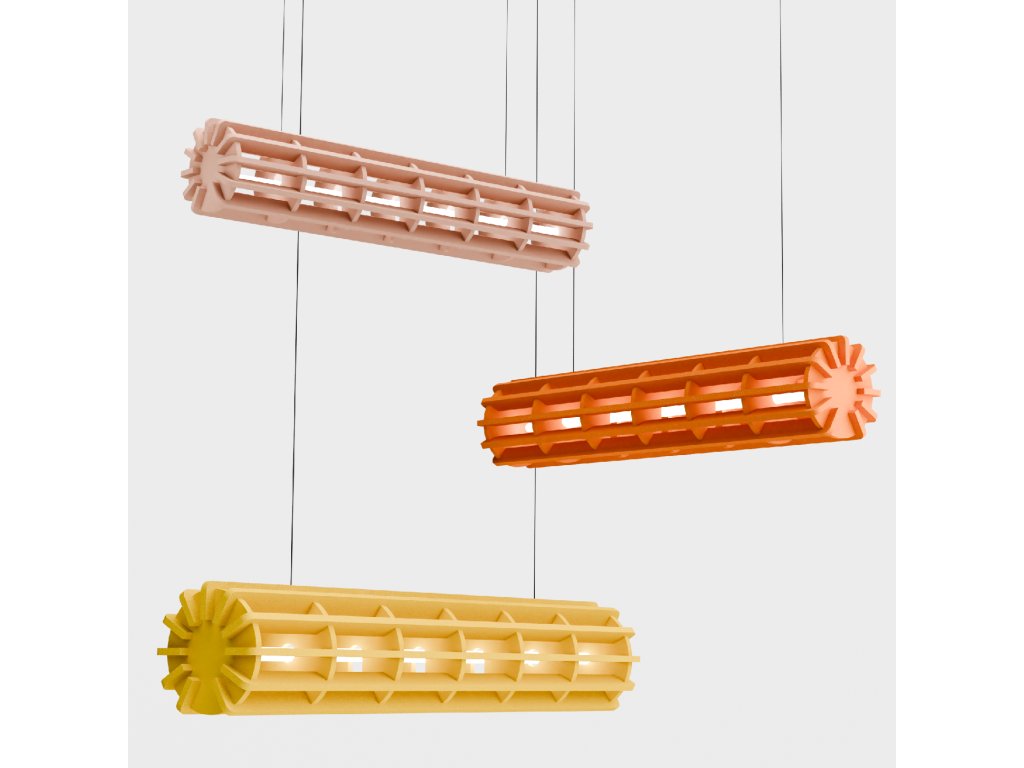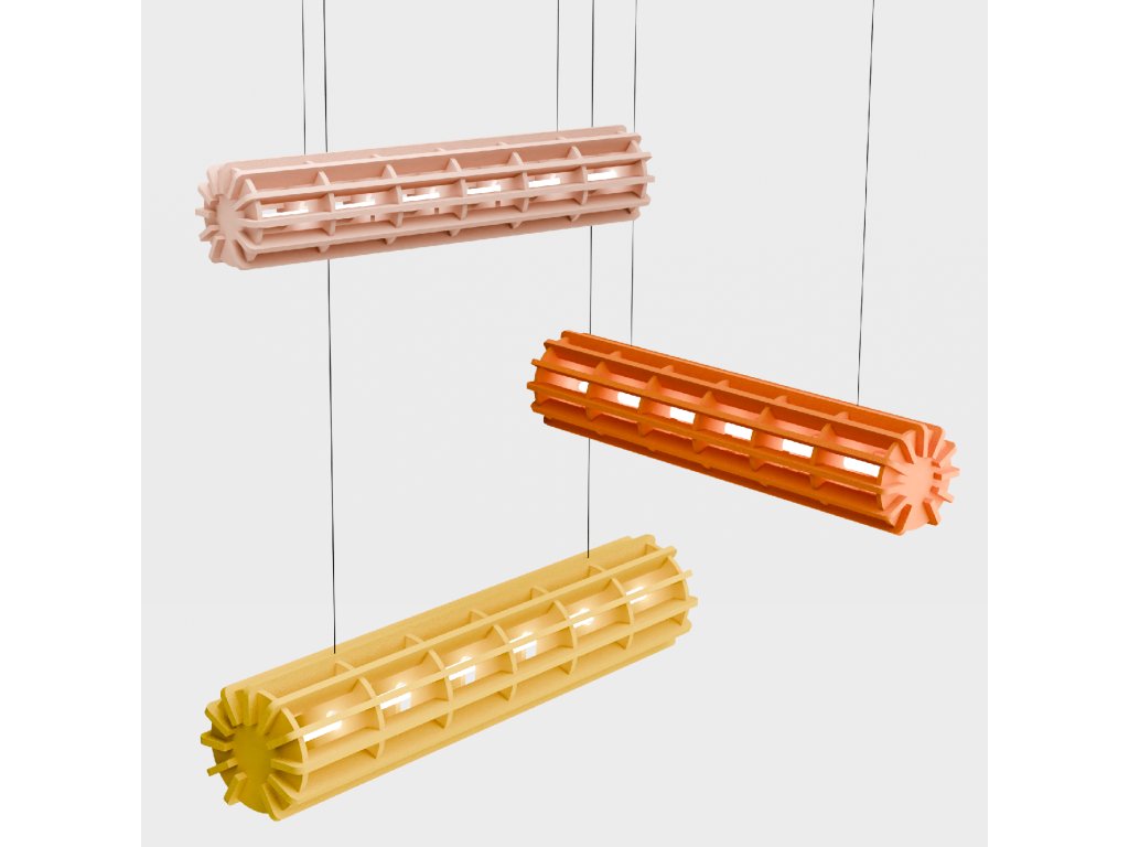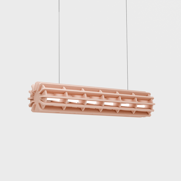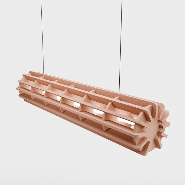 Stínidlo je tvořeno válcovitou konstrukcí s plastickým členěním, které vytváří výrazný architektonický efekt. Stínidlo je tvarováno do podélného profilu s jemně členěným povrchem, což napomáhá jak akustické funkci, tak rovnoměrnému rozptýlení světla z trubicového LED modulu s difuzorem. |